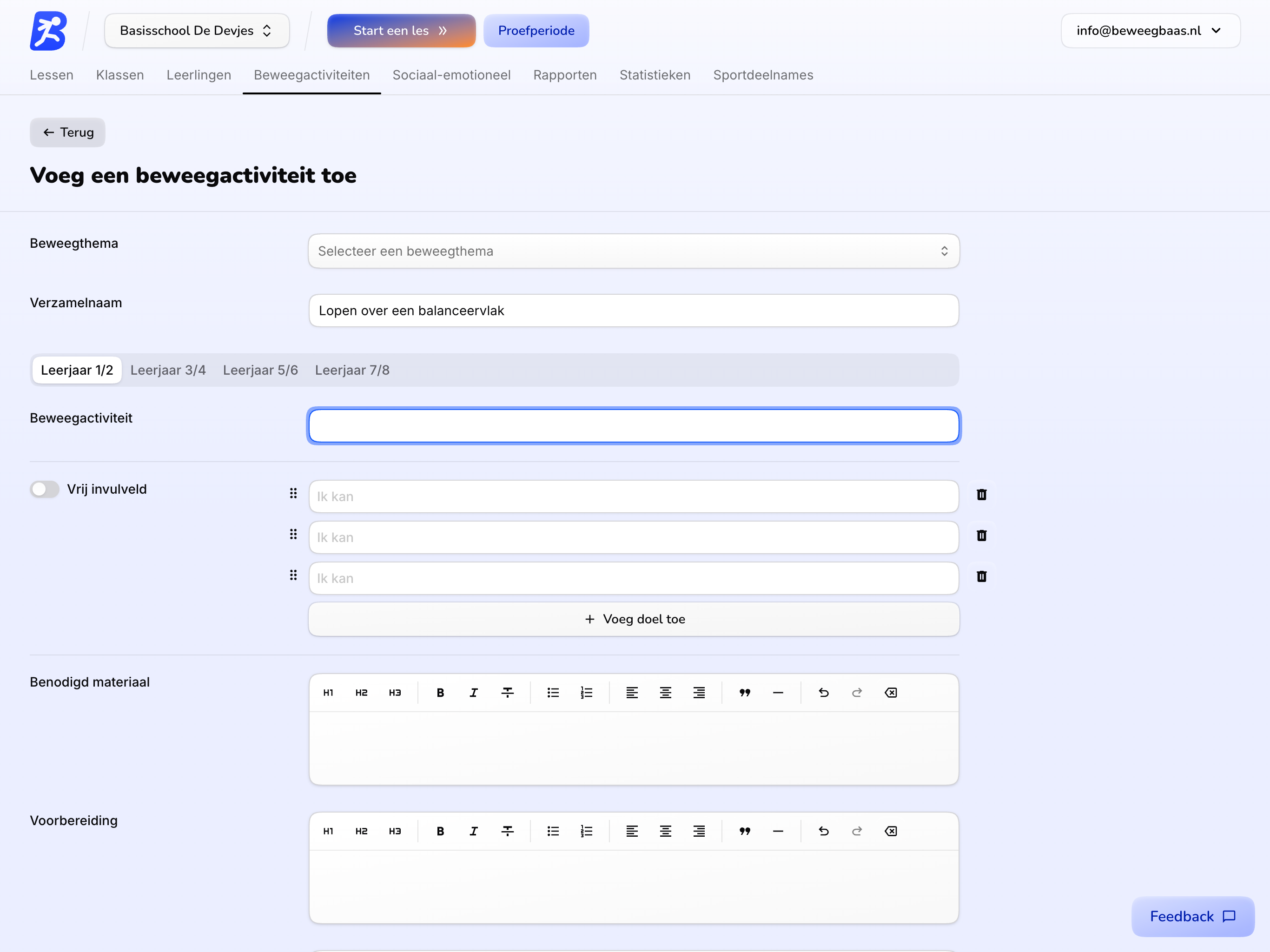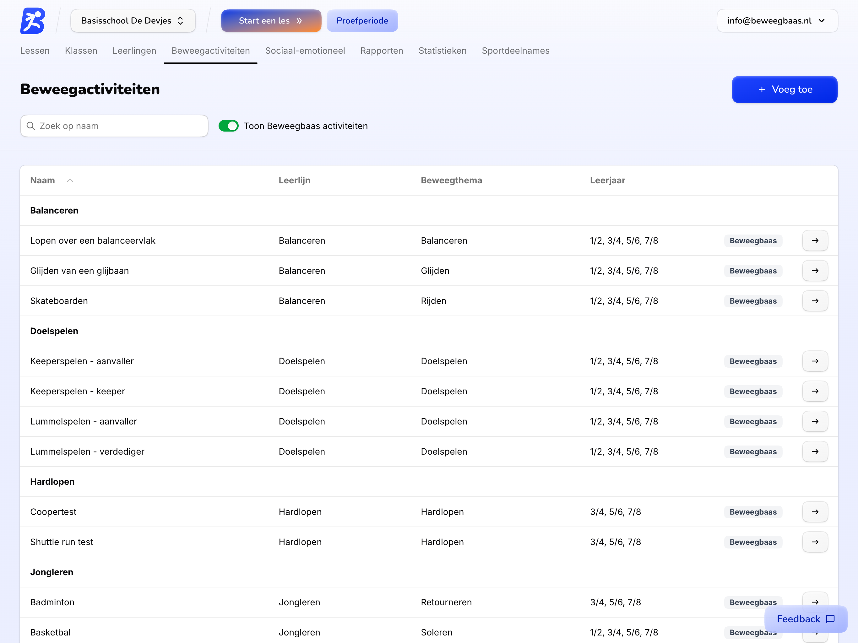 Krijg in één oogopslag overzicht van alle beweegactiviteiten en sociaal-emotionele doelen binnen Beweegbaas. Mis je een activiteit of sluit een doel nog niet helemaal aan? Maak eenvoudig nieuwe beweegactiviteiten of sociaal-emotionele doelen aan en bouw zo aan doorlopende leerlijnen die perfect passen bij jouw leerlingen.