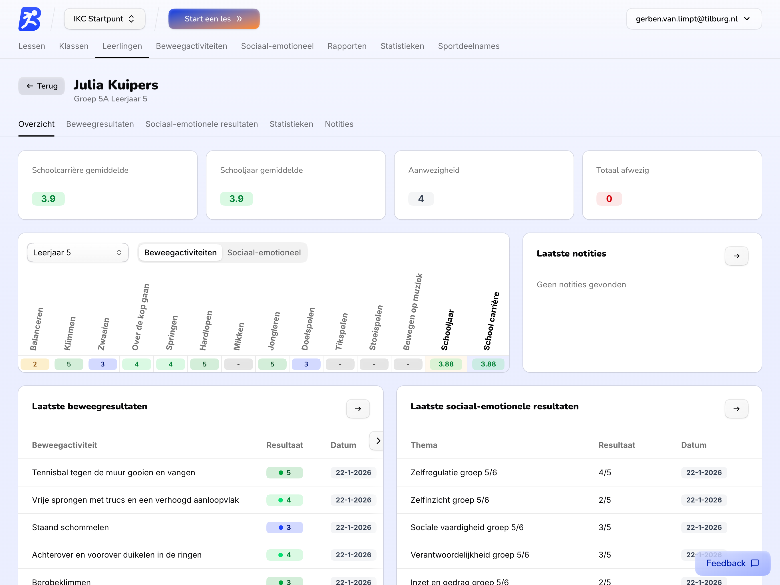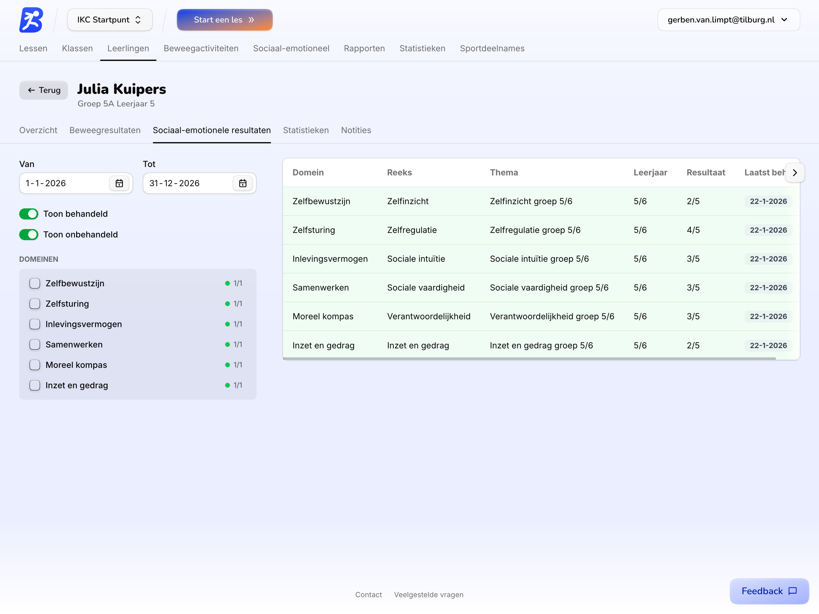 Bekijk de voortgang van een hele groep of zoom in op één leerling. Alle ingevoerde data komt samen in een helder en intuïtief dashboard, zodat je snel inzicht krijgt in wat er bereikt is.